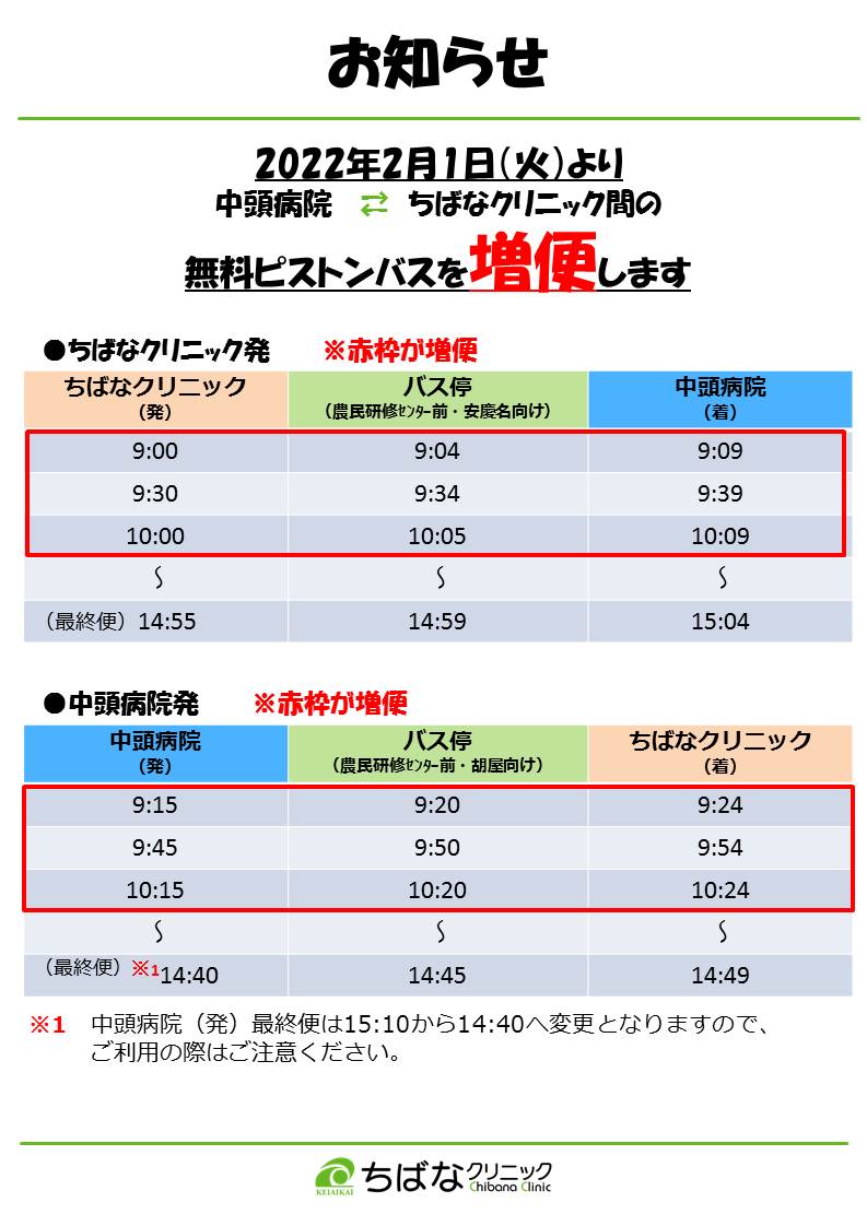 2022年2月1日(火)より、ちばなクリニックと中頭病院を結ぶ無料シャトルバスについて、ちばなクリニック発、中頭病院発それぞれ午前9時台に3便増便します。詳細はチラシ画像および以下のページをご覧ください。