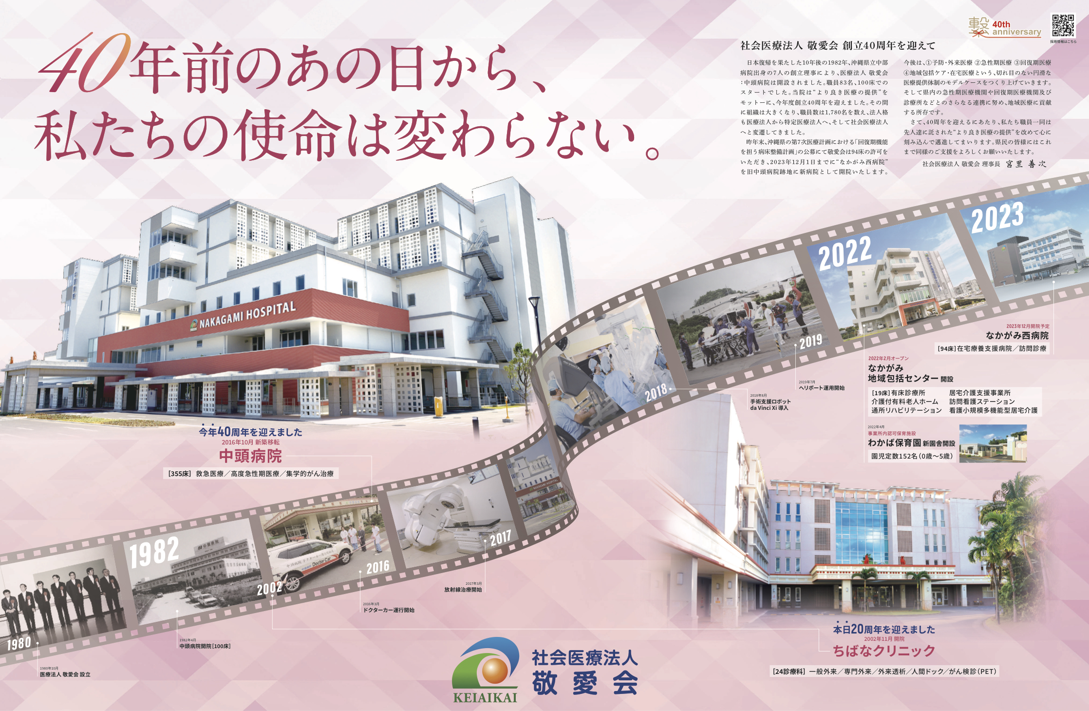 日本復帰を果たした10年後の1982年、沖縄県立中部病院出身の7人の創立理事により、医療法人 敬愛会:中頭病院は開設されました。職員83名、100床でのスタートでした。当院は“より良き医療の提供”をモットーに、今年度創立40周年を迎えました。その間に組織は大きくなり、職員数は1,780名を数え、法人格も医療法人から特定医療法人へ、そして社会医療法人へと変遷してきました。