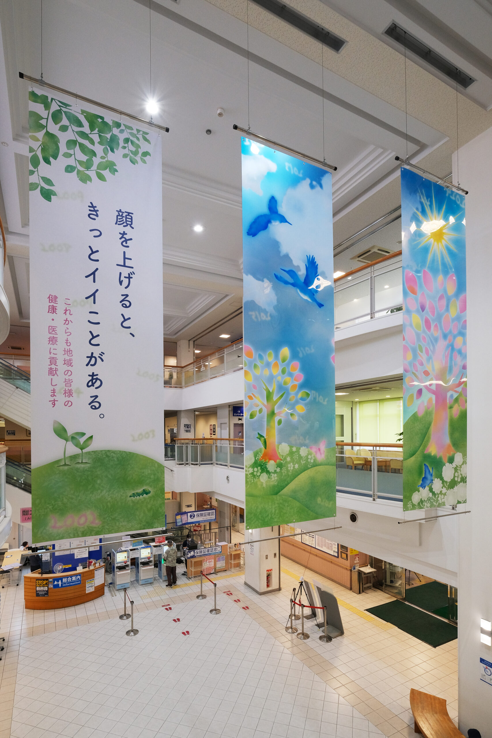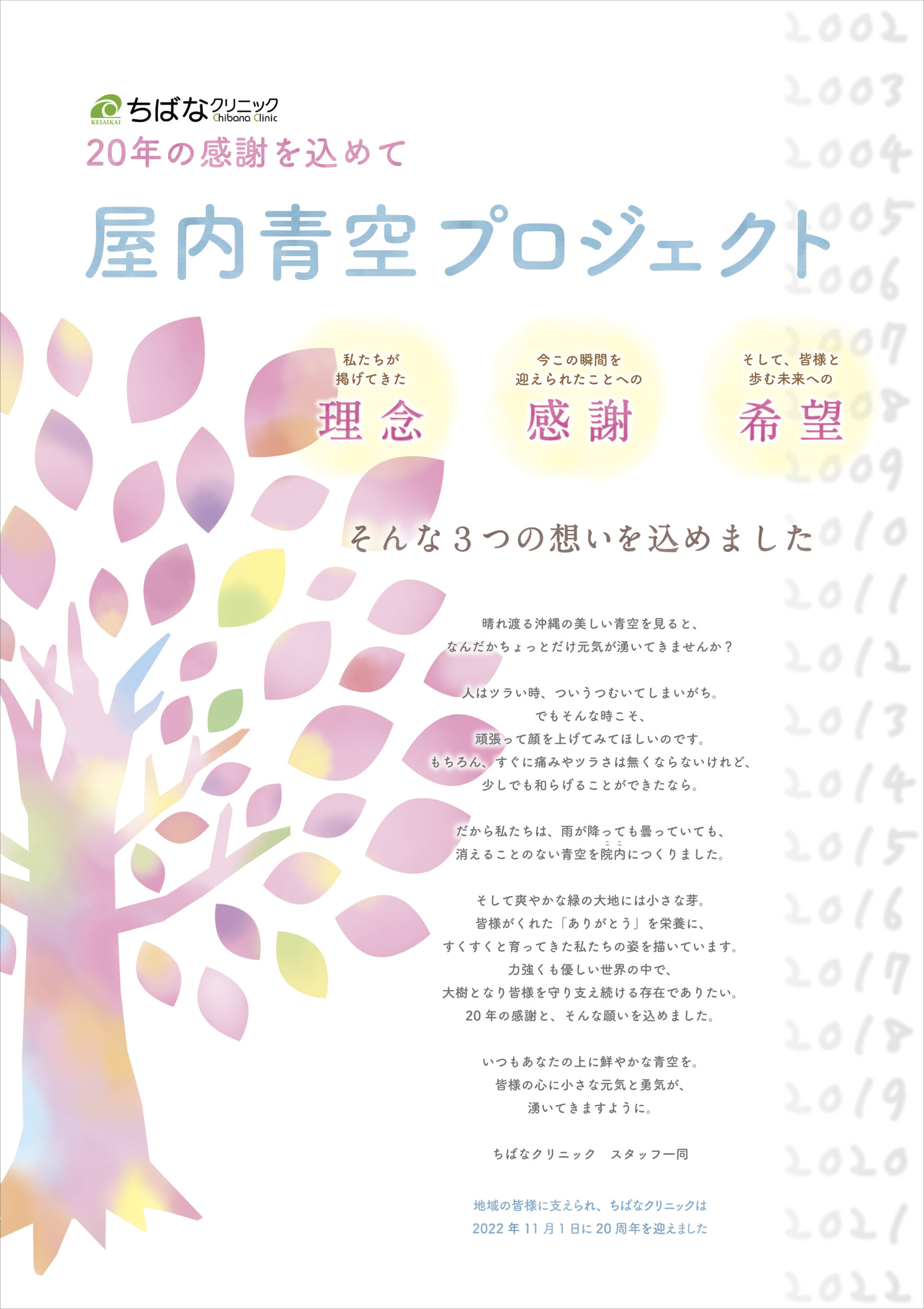 地域の皆様に支えられ、ちばなクリニックは2022年11月1日に開院20周年を迎えました。この記念企画として、現在、3本の垂れ幕を吹抜けに掲示しています。この垂れ幕には、以下の3つの想いを込めています。