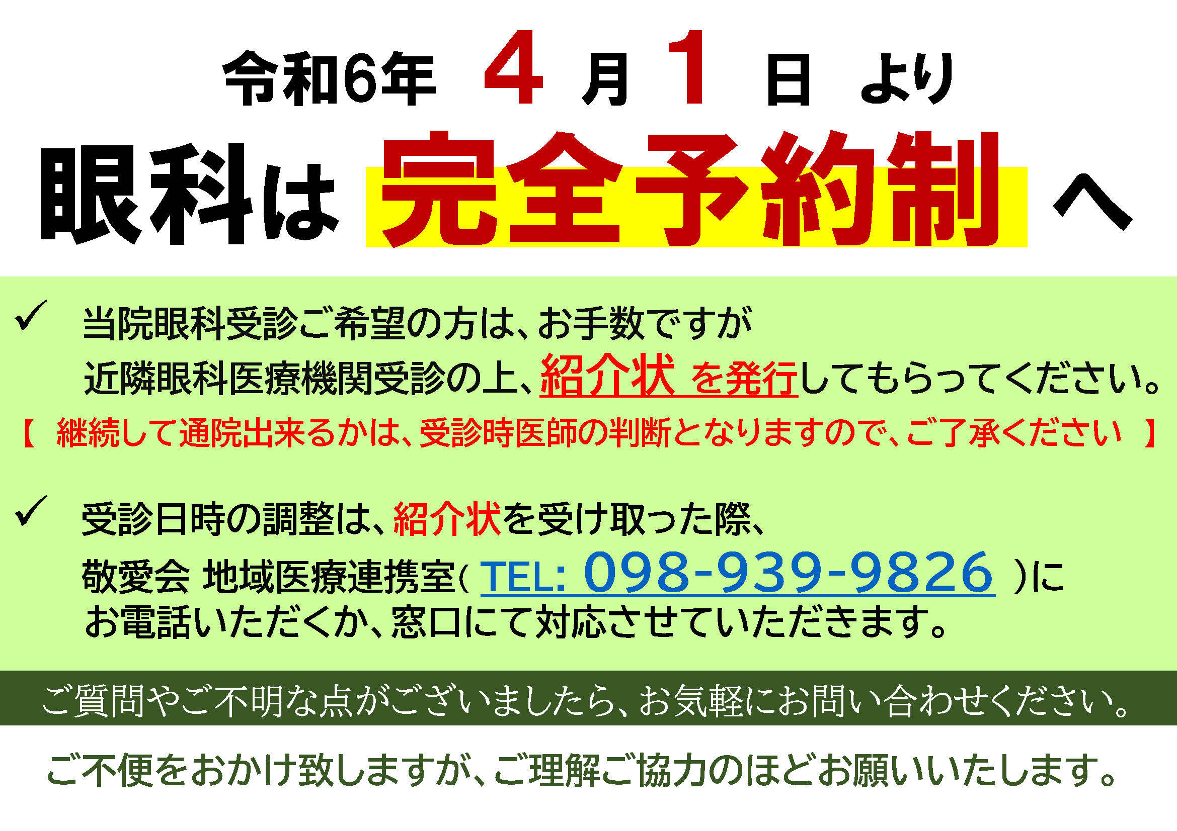 令和6年4月1日より眼科は完全予約制となり、以下のように対応させて頂きます。みなさまにはご不便をお掛けすることになりますが、ご理解ご協力お願いします。