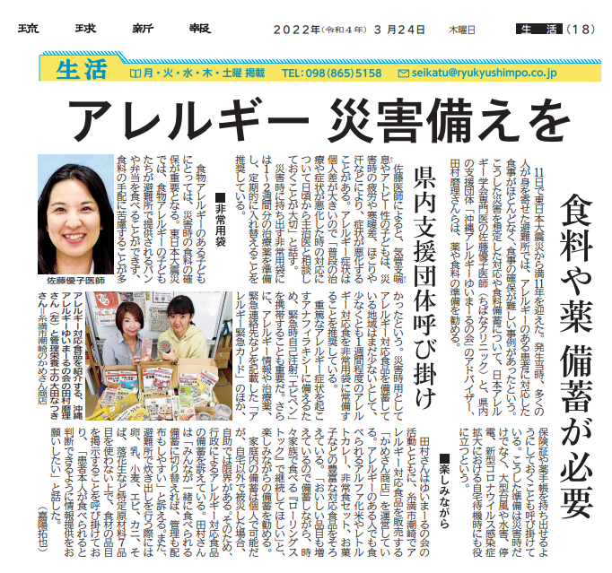 3月24日付けの琉球新報に、当科アレルギー外来担当佐藤医師の取材記事が掲載されました。『災害時のアレルギー対応』についての記事です。
