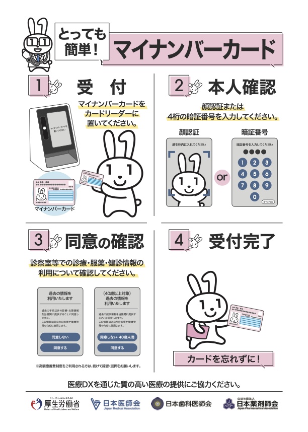 当院ではオンライン資格確認を行う体制を有しており、薬剤情報、特定健診情報など患者さんの診療情報を取得・活用することで、質の高い医療の提供に努めています。正確な情報を取得・活用するため、マイナ保険証の利用にご協力をお願いいたします。