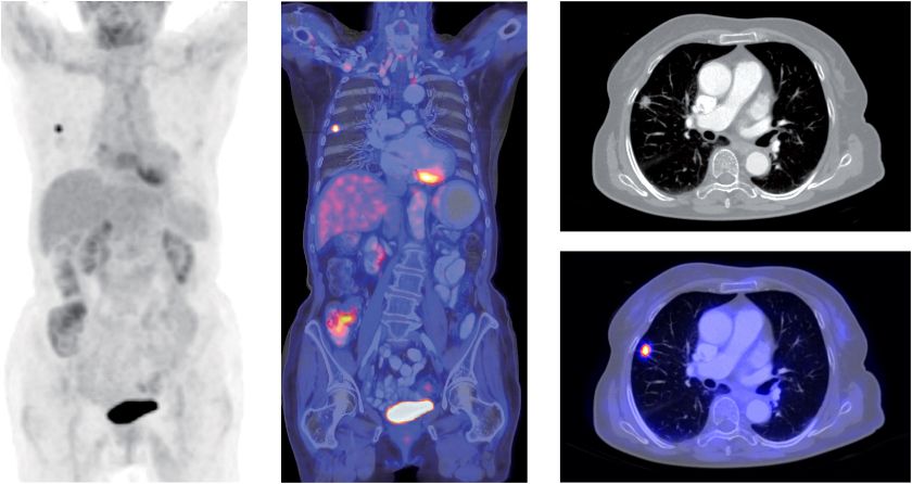 検査を受ける患者さんへの負担は非常に軽く、ブドウ糖によく似た構造の放射性医薬品(FDG)を静脈注射し、全身に行き渡らせる為に60分安静後、30分間のスキャンで全身の検査が完了します。